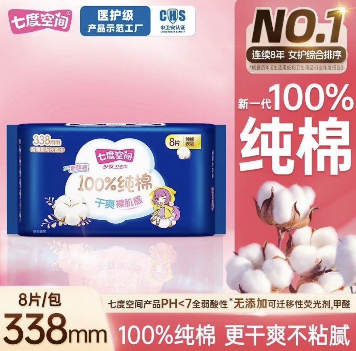 【七度空间】8片装少女系列纯棉表层卫生巾加长夜用透气柔棉338mm/袋